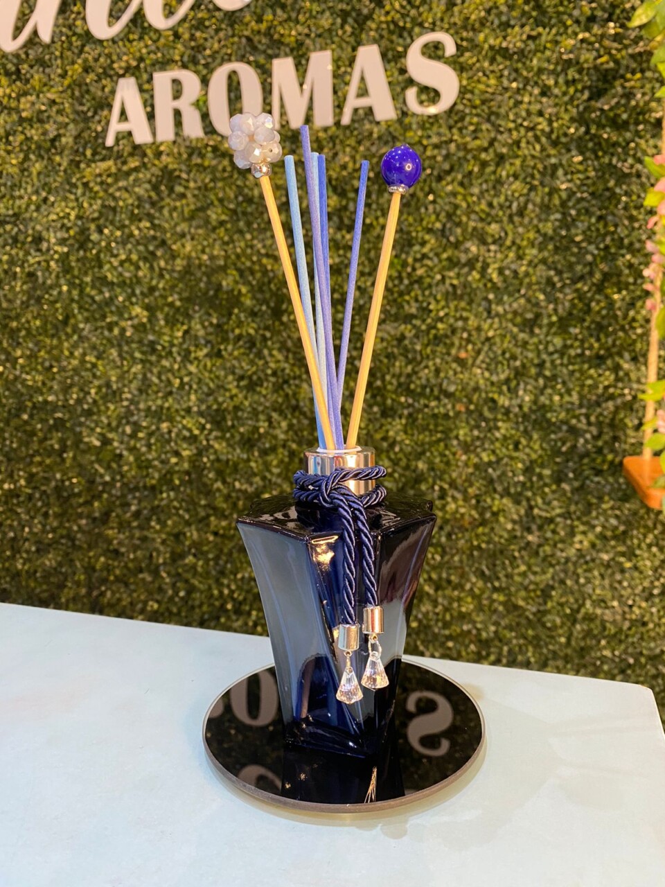Vidro ellegance azul degradê, tampas na cor prateada, 5 varetas de fibra de algodão azul e 2 varetas luxo , bandeja de vidro preta.