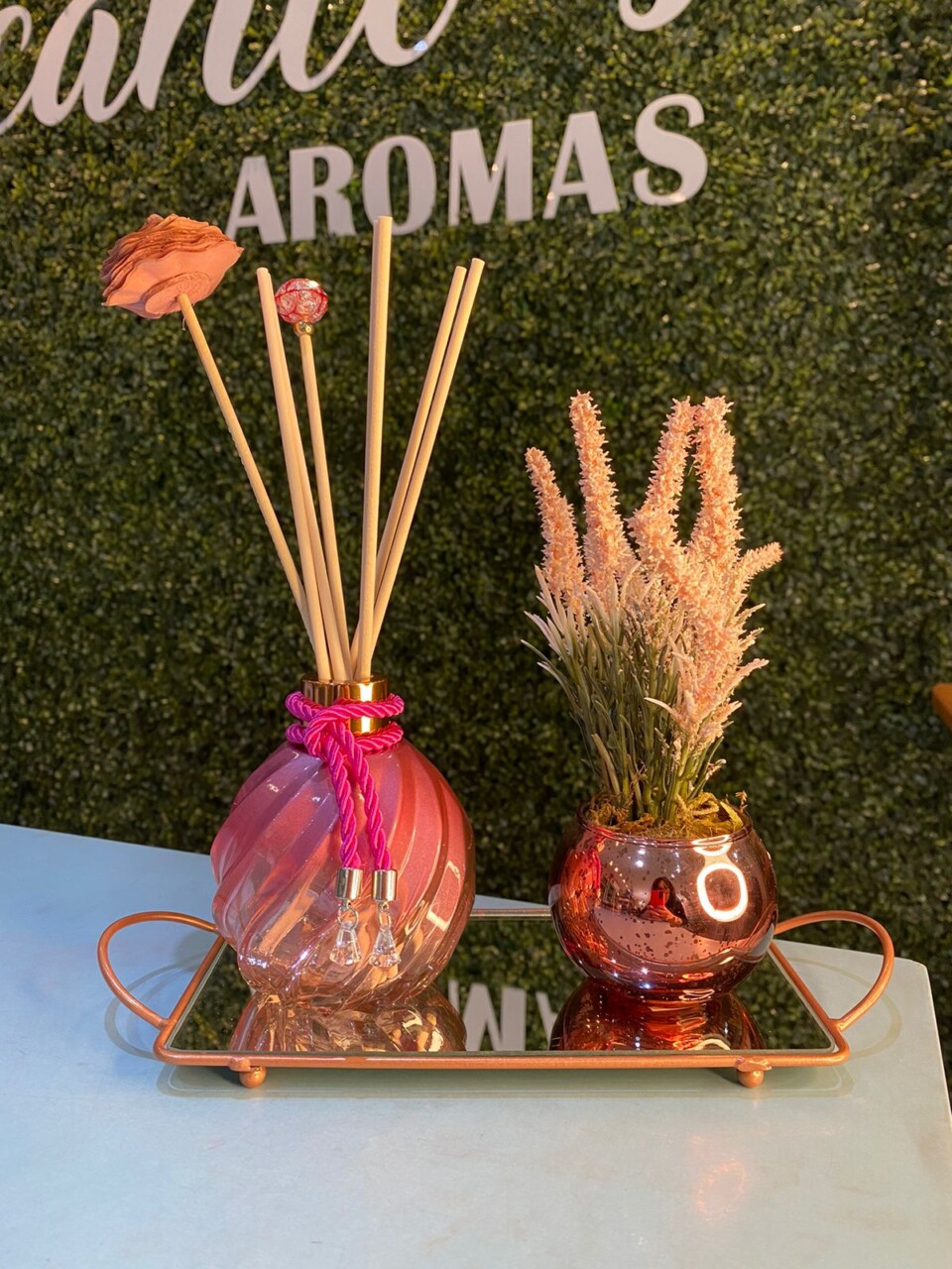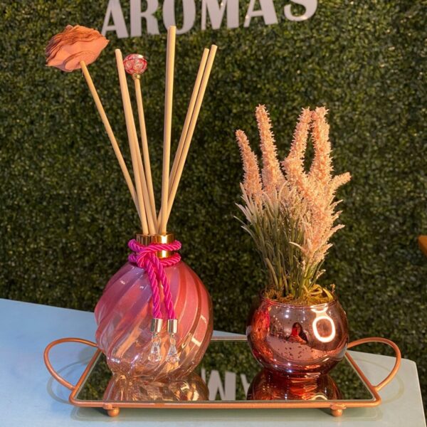 Vidro espiral rosa degradê, tampa na cor bronze, 6 varetas de fibra de algodão bege e 2 varetas luxo , bandeja de vidro em ferro rosé com espelho, vaso rosé efeito mármore com planta artificial.
