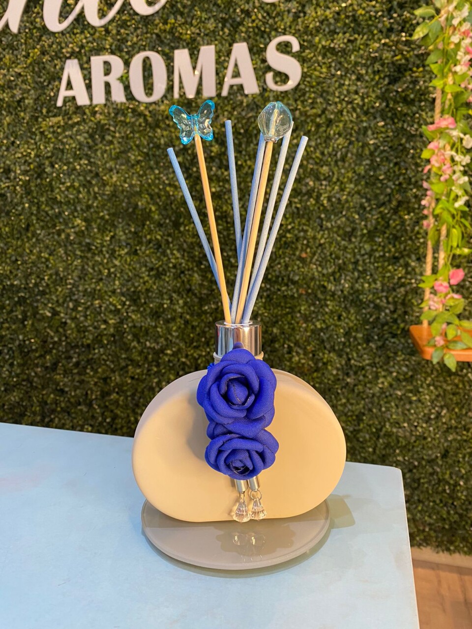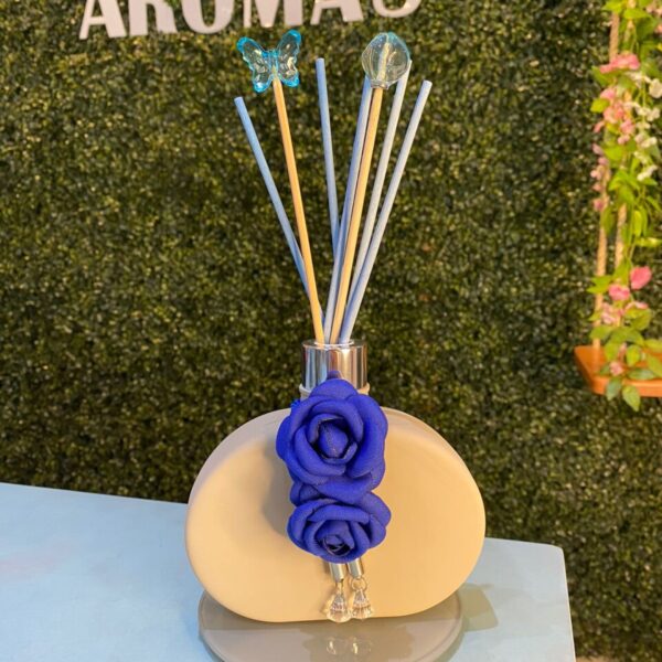 Vidro nina creme fosco, tampas na cor prateada, 5 varetas de fibra de algodão azul e 2 varetas luxo , bandeja de vidro acinzentada.