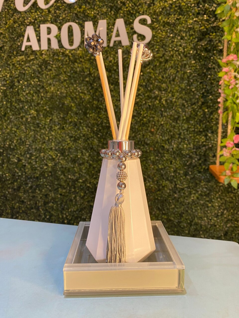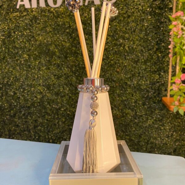 Vidro queen branco, tampa na cor prateada, 5 varetas de fibra de algodão branca e 2 varetas luxo , bandeja de vidro cinza.