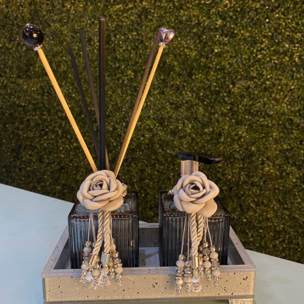 Vidro canelado preto transparente, tampas na cor preta, 5 varetas de fibra de algodão pretas e 2 varetas luxo , bandeja de vidro efeito mármore.