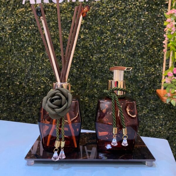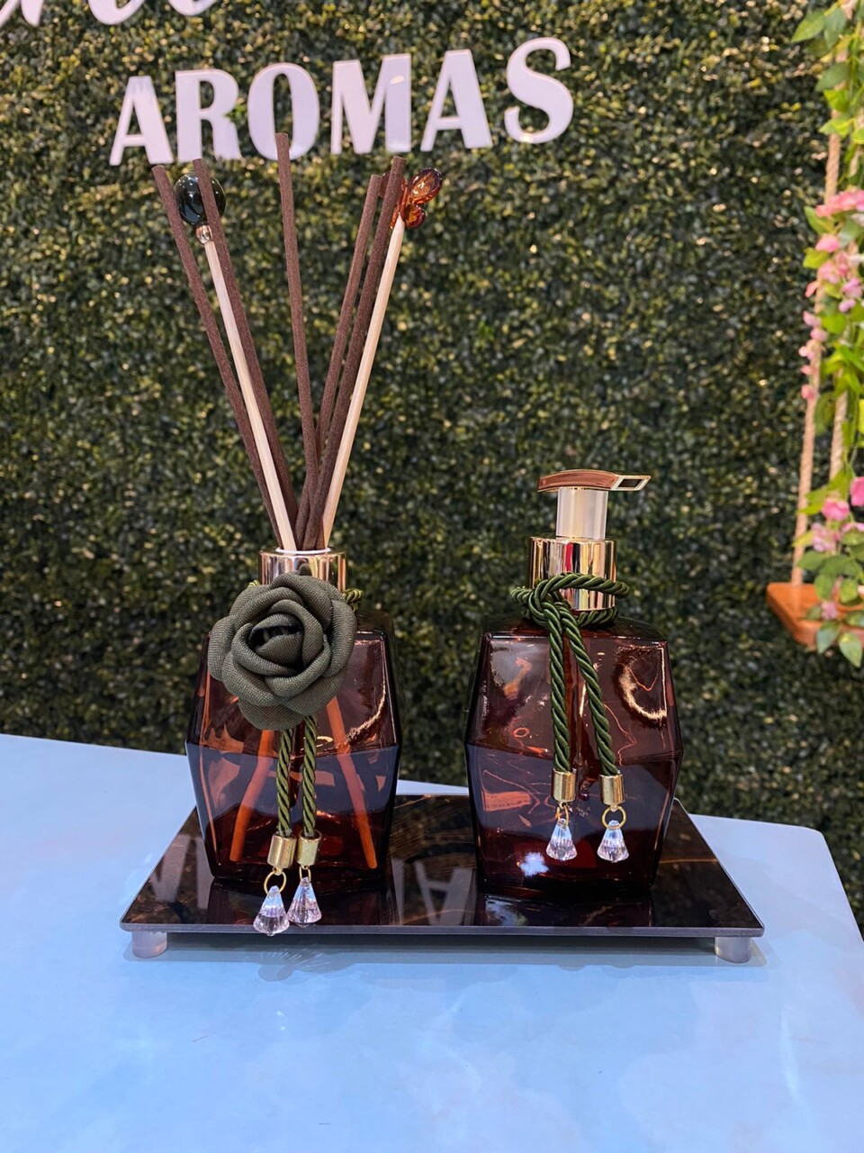 Vidro diamante marrom, tampas na cor dourada, 5 varetas de fibra de algodão preta e 2 varetas luxo , bandeja de vidro marrom efeito marmorizada.