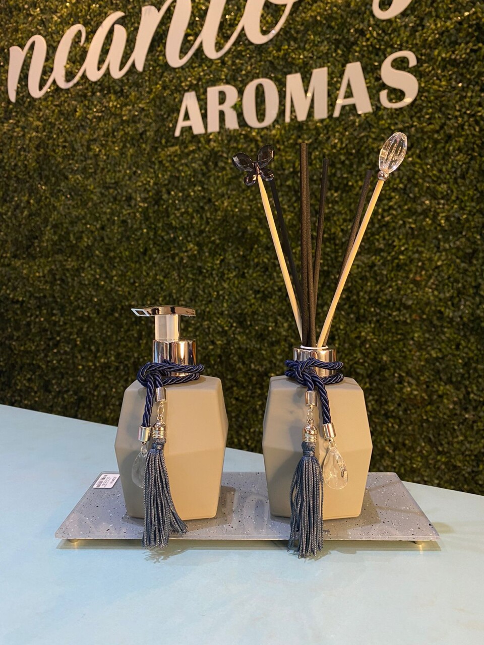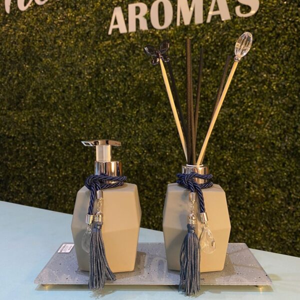 Vidro diamante cinza fosco, tampas na cor prateada, 5 varetas de fibra de algodão pretas e 2 varetas luxo , bandeja de vidro cinza efeito mármore.