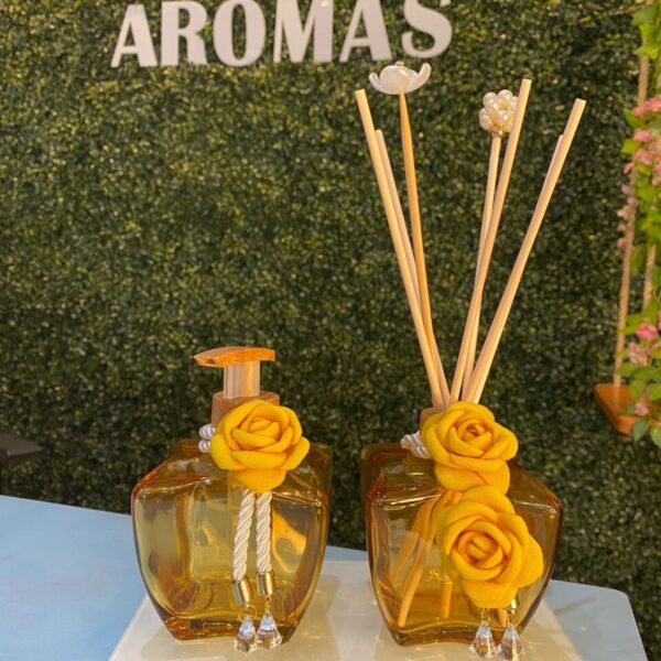 Vidro estrela âmbar, tampas na cor madeira, 5 varetas de fibra de algodão bege e 2 varetas luxo , bandeja de vidro branca.