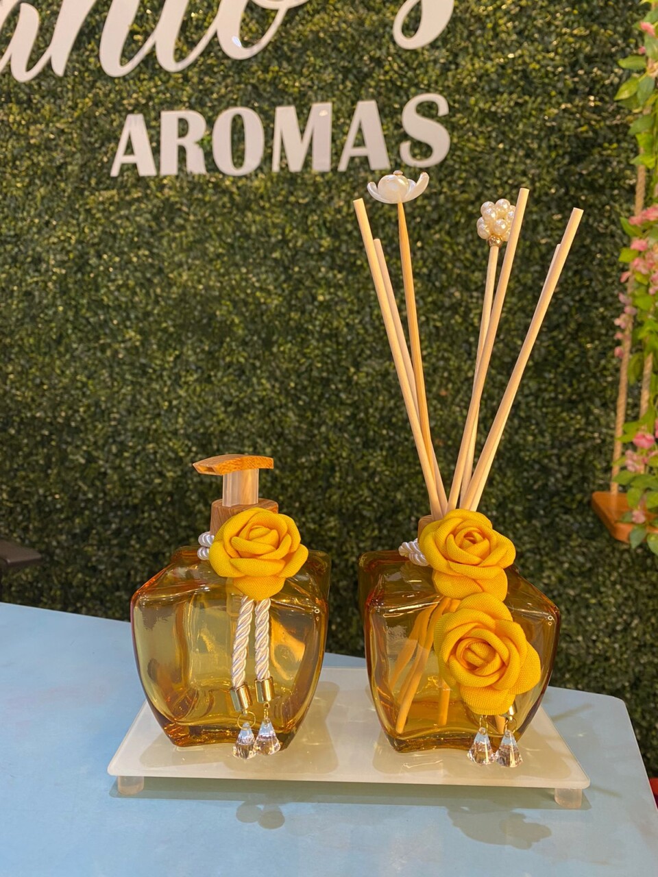 Vidro estrela âmbar, tampas na cor madeira, 5 varetas de fibra de algodão bege e 2 varetas luxo , bandeja de vidro branca.