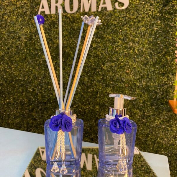 Vidro imperial azul, tampas na cor prateada, 5 varetas de fibra de algodão azul e 2 varetas luxo , bandeja de vidro com espelho.