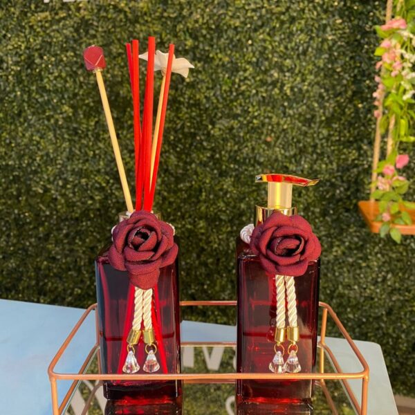 Vidro paris vermelho, tampas na cor dourada, 5 varetas de fibra de algodão vermelhas e 2 varetas luxo , bandeja em ferro bronze com espelho.