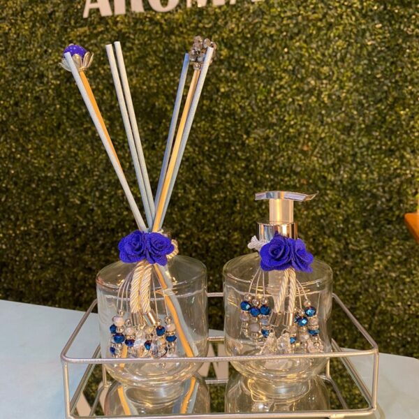 Vidro rubi transparente, tampa na cor prateada, 5 varetas de fibra de algodão azul e 2 varetas luxo , bandeja em ferro prata com espelho.