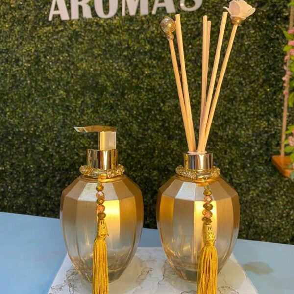 Vidro turmalina dourado fosco degradê, tampas na cor dourada, 5 varetas de fibra de algodão bege e 2 varetas luxo , bandeja de vidro branca efeito marmorizado com detalhes dourados.